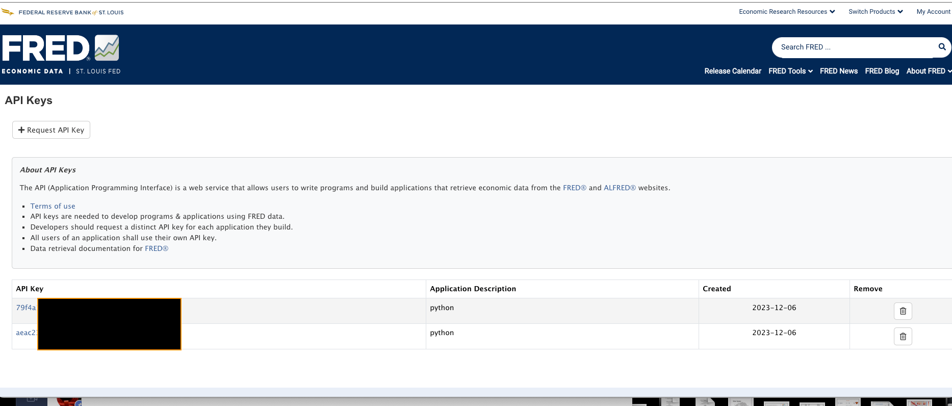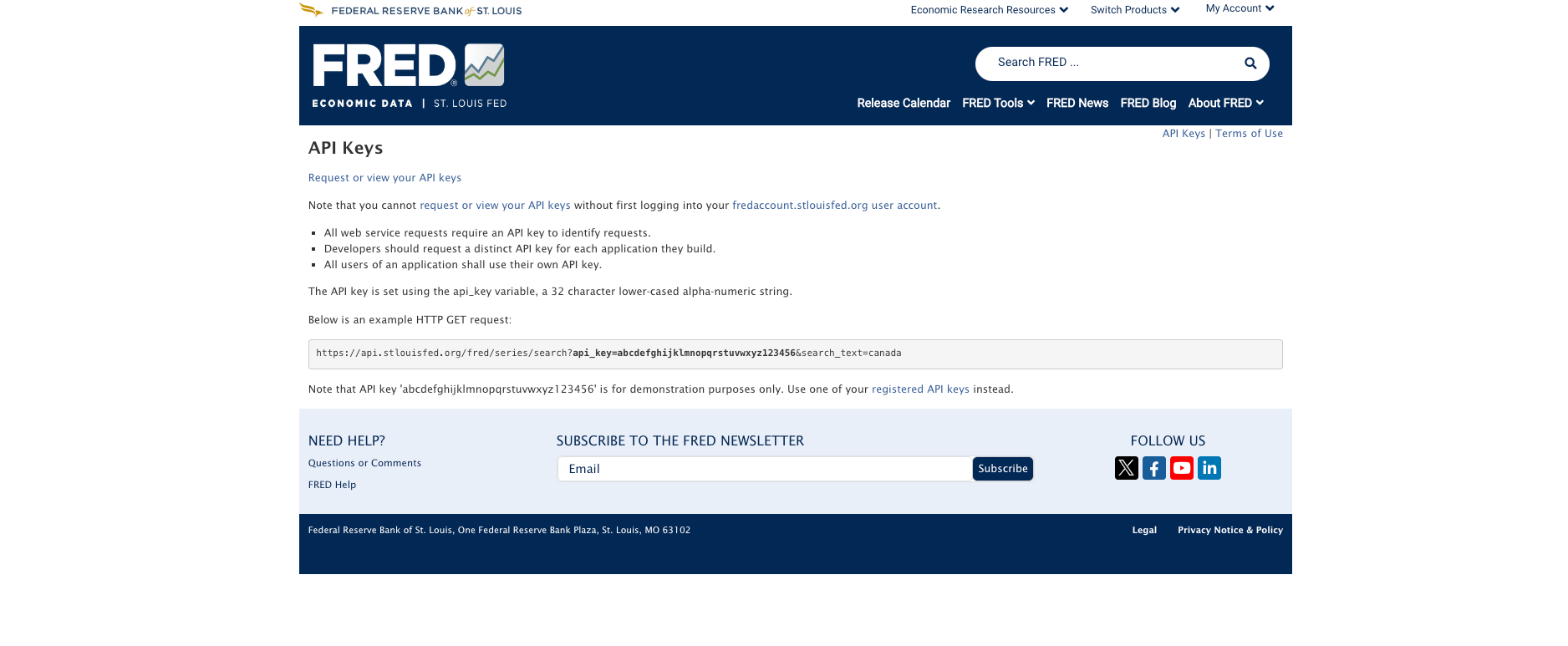 TKU_1105 1105_0 Request FRED API cy.lu 19 Oct 2024 • 1 min read Photo by Karsten Winegeart / Unsplash Link 到 FRED Website ( 可用 google account sign in )St. Louis Fed Web Services: API Keymini fred logoRequest or view your API KeyAPI Key 申請完成