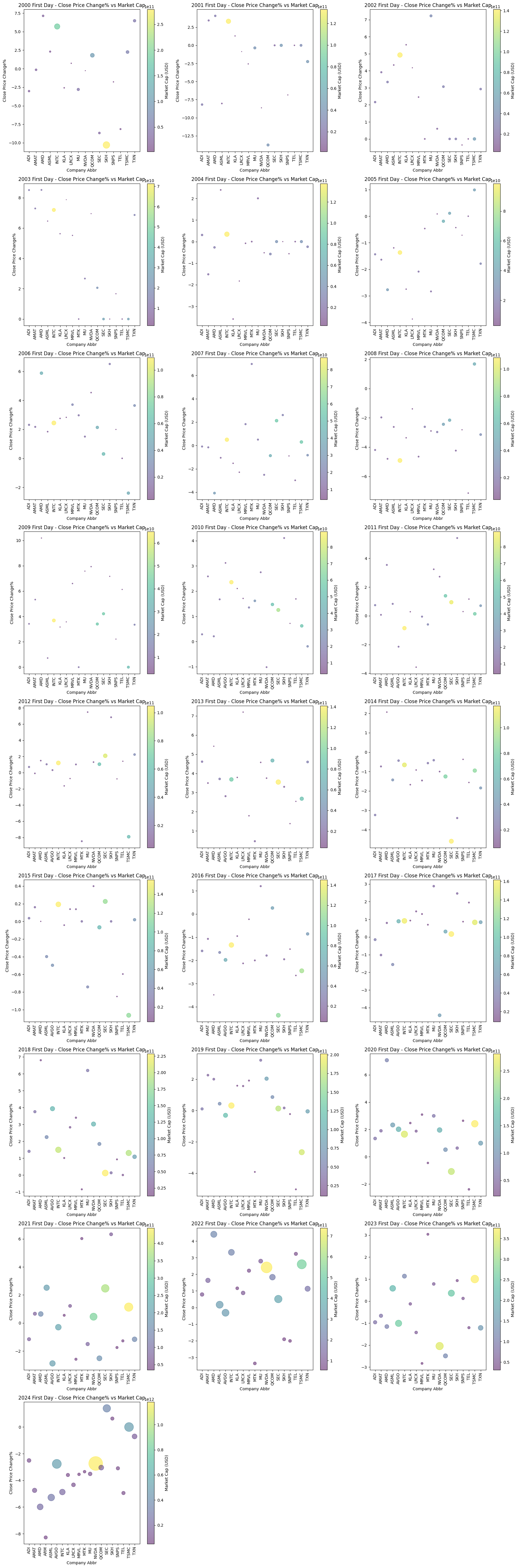 Close Price Change%)。這個百分比反映了該公司與前一日相比的股價波動。數值為正表示股價上升,數值為負表示股價下降。 - 氣泡大小:每個氣泡的大小代表了該公司在當年第一個交易日的市值(