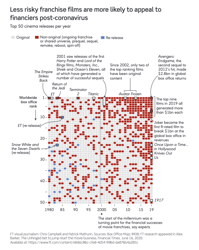 這張圖表來自 《Financial Times》,主題是 "Less risky franchise films are more likely to appeal to financiers post-coronavirus",解釋了在電影產業中,原創電影與**非原創(續集、重啟、衍生作品等)**電影在全球票房中的表現。圖表按年份和票房排名展示了每年發行的前 50 部電影。