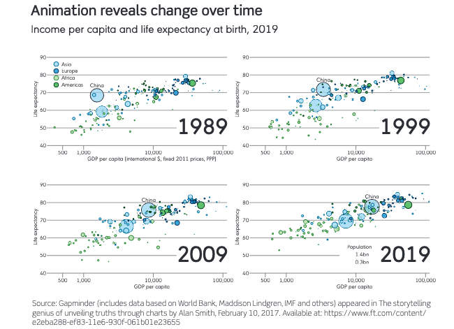- 這是一個顯示隨著時間推移,從 1989 年到 2019 年各國人均收入和預期壽命如何變化的動畫式圖表。