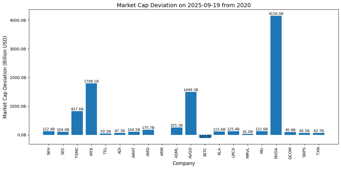 這張圖展示了各家半導體公司在 2025-09-19 相較於 2023 年年初 的 市值變動(Market Cap Deviation),數據單位是 十億美元(Billion USD)。這些變動數值顯示每家公司在這段時間內的市值增減情況。