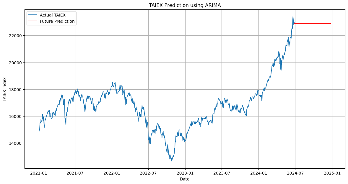 model = ARIMA(taiex_data, order=(5,1,0)) # ARIMA(p,d,q) 中選擇適當的 p, d, q 參數