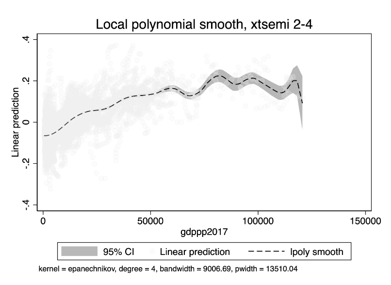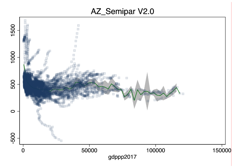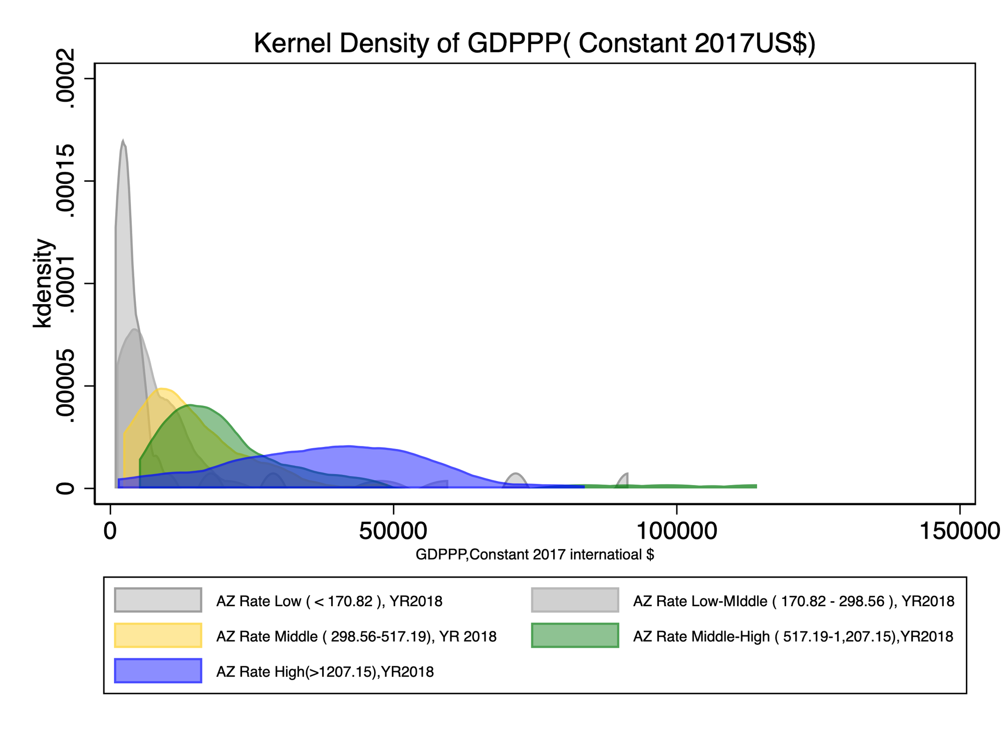 在Kernel Density 的分布中,我們有理由相信,隨著 GDP 的增加, AZPV Rate 也會同時增加。