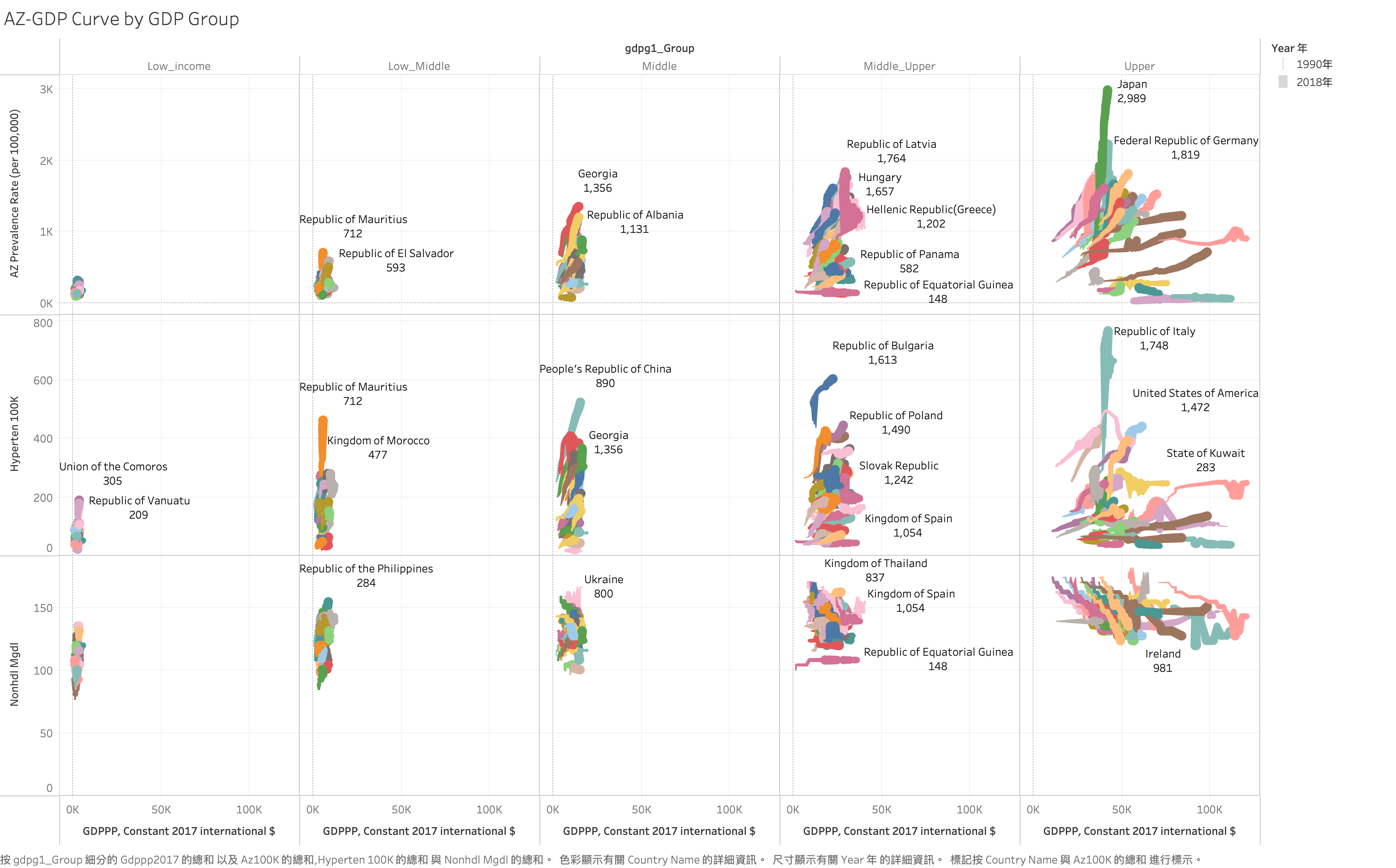 基於GBD所提供的資料,我們以 machine learning K-means clustering, GDP分群之後,可以觀察到大約 80%的國家在GDPPP成長的過程中, AZ PVRate 也會隨著經 GDP 成長。