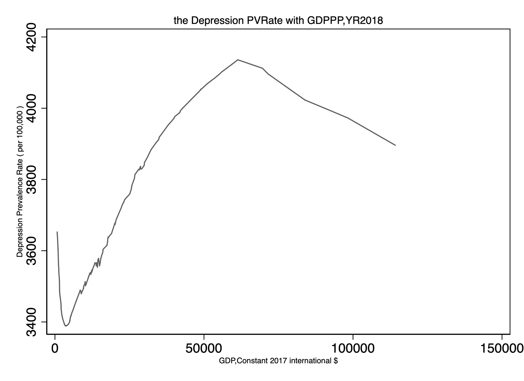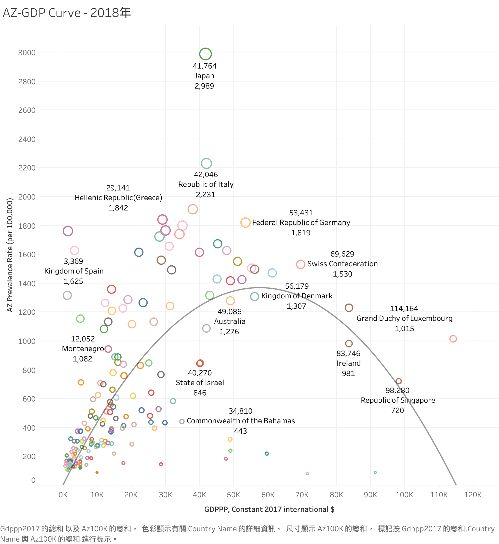 以 1990-2018 資料為基礎, YR2018年 Alzheimer's Prevalence Rate 在所得 US$ 41,764 之後開始下降。