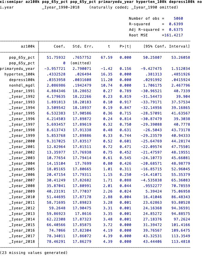 xi:semipar az100k pop_65y_pct pop_65y_pct primaryedu_year hyperten_100k depress100k nonhdl_mgdl i.year,nonpar(gdppp2017) ci