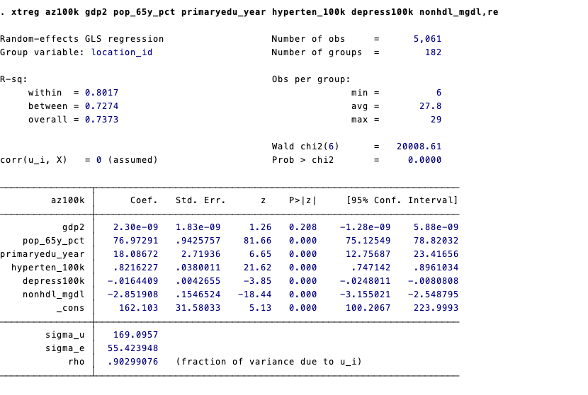 xtreg az100k gdp2 pop_65y_pct pop_65y_pct primaryedu_year hyperten_100k depress100k nonhdl_mgdl,re