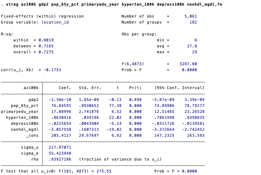 xtreg az100k gdp2 pop_65y_pct pop_65y_pct primaryedu_year hyperten_100k depress100k nonhdl_mgdl,fe