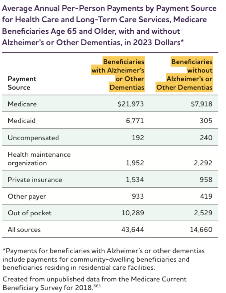 引用 2024 Alzheimer's disease Facts and Figures (Alzheimer's Association),平均每位阿茲海默症或其他失智症患者的每年支出成本為 US$43,644 ( 合約 NTD$ 140萬)