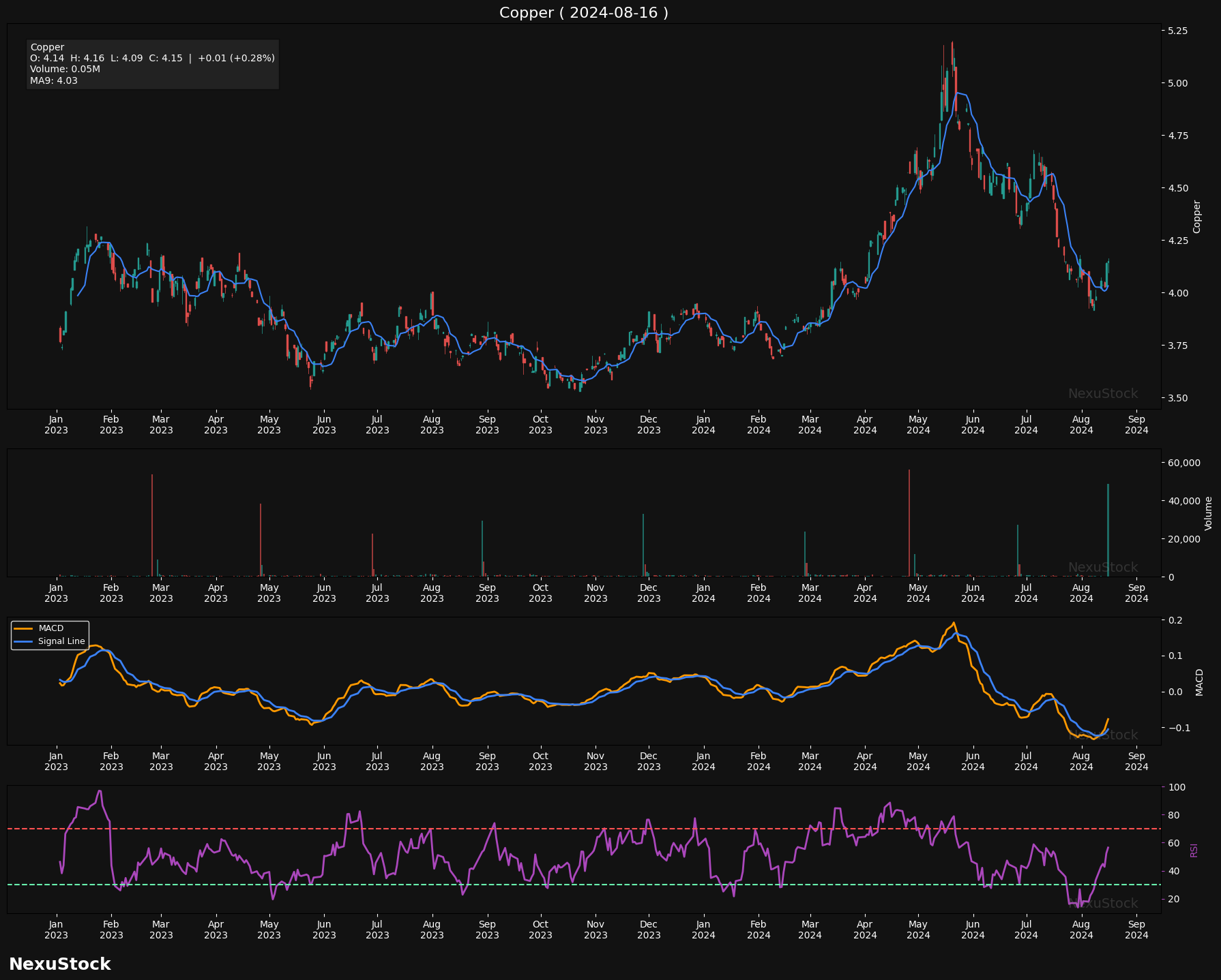 - 圖表顯示,銅價在 2024 年中期達到高點後進行了顯著回調,但近期價格出現反彈,並重新站上 9 期移動平均線 (MA9)。