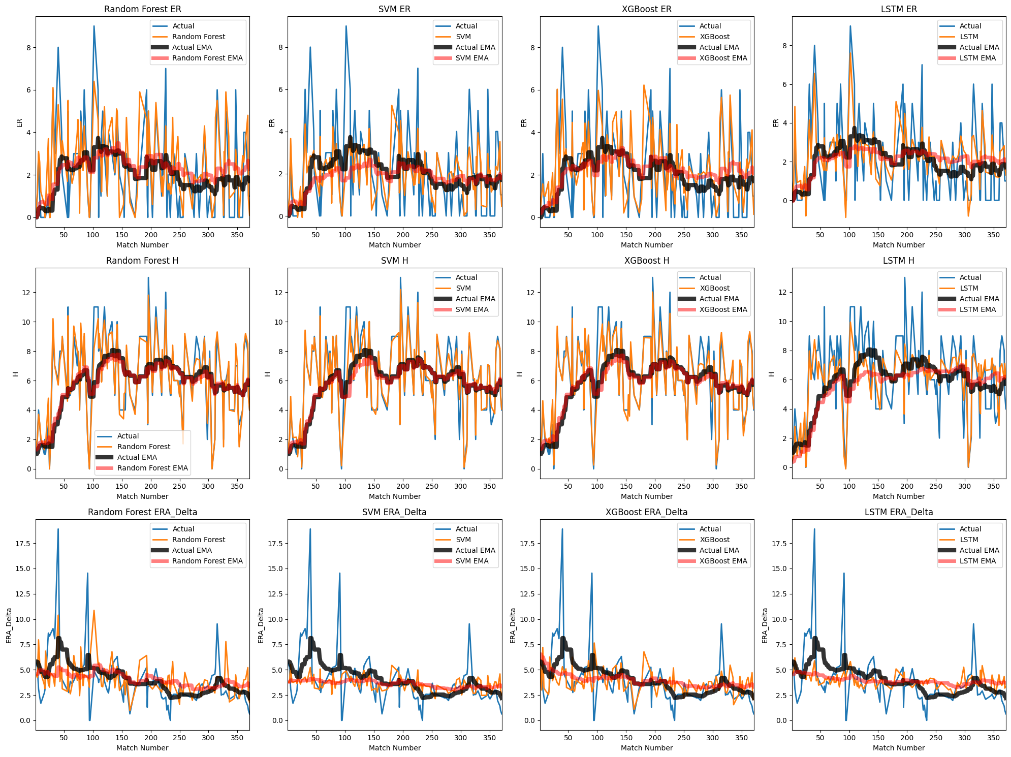 在這項研究中,我們使用隨機森林、支持向量機、XGBoost和LSTM四種不同的機器學習模型來預測三個關鍵的棒球數據指標:ER(Earned Run)、H(Hits)和ERA_Delta(Earned Run Average Delta)。圖1顯示了這些模型的預測結果及其與實際值的比較。以下是對每個模型的預測準確性和績效指標的深入分析。