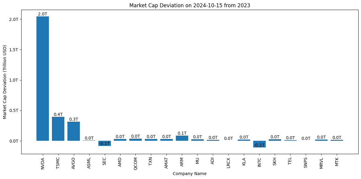 這張圖展示了各家半導體公司在 2024-10-15 相較於 2023 年年初 的 市值變動(Market Cap Deviation),數據單位是 十億美元(Billion USD)。這些變動數值顯示每家公司在這段時間內的市值增減情況。 圖表解釋: 1. Y 軸:表示市值的變動值,以 十億美元 為單位。正值代表公司市值增加,負值代表公司市值下降。 * 例如,NVIDIA(NVDA)的市值增加了超過 2,000 億美元(2T USD 即 2 兆美元),這表明該公司在 2024 年的市場表現極其強勁。 * 其他公司如 TSMC 和 Broadcom(AVGO)也有較顯著的增長,但相比 NVIDIA,增幅較小。 2.