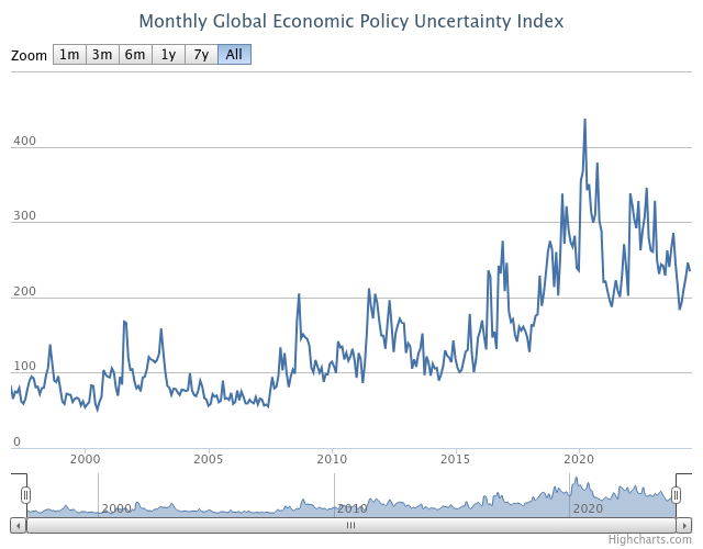 此圖直觀地展示了EPU指數如何隨著重大全球和政治事件發生波動,清楚地顯示了不確定性隨著時間的趨勢。