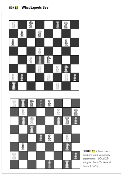 - 當棋盤呈現「真實對局」配置時,國際象棋高手(專家)能記住比新手多得多的棋子位置。