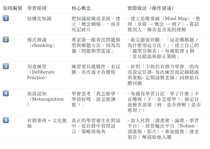 成為專家的五大原則 × 操作建議 對照表