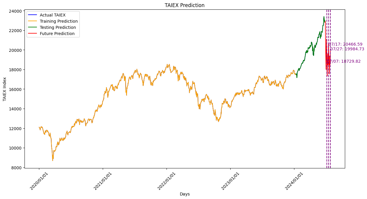 plt.text(future_dates[day], future_predictions[day], f'{future_dates[day].strftime("%m/%d")}: {future_predictions[day]:.2f}', color='purple')