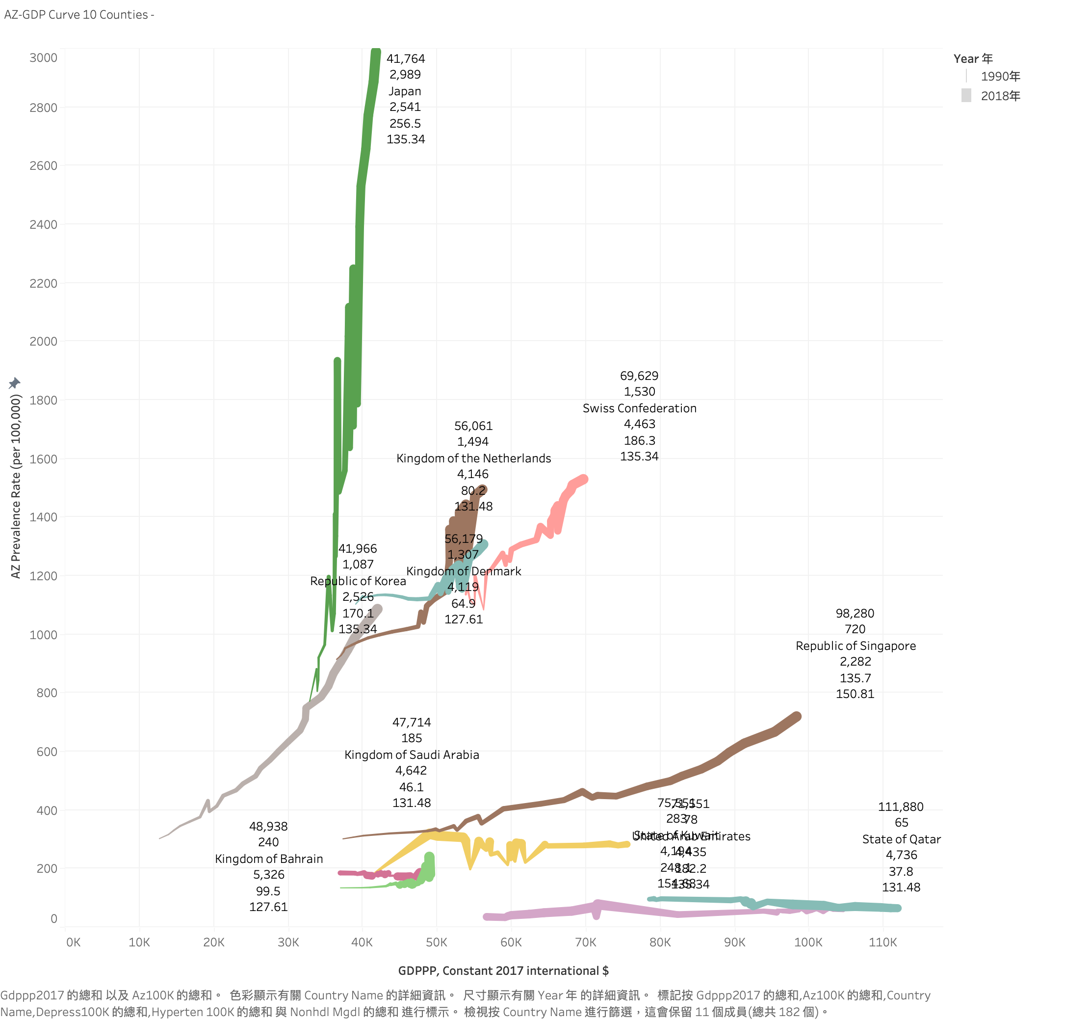 假設我們有一個數據集,包含各國的GDPPP及疾病盛行率。我們希望將這些客戶分成五個群集,步驟如下: