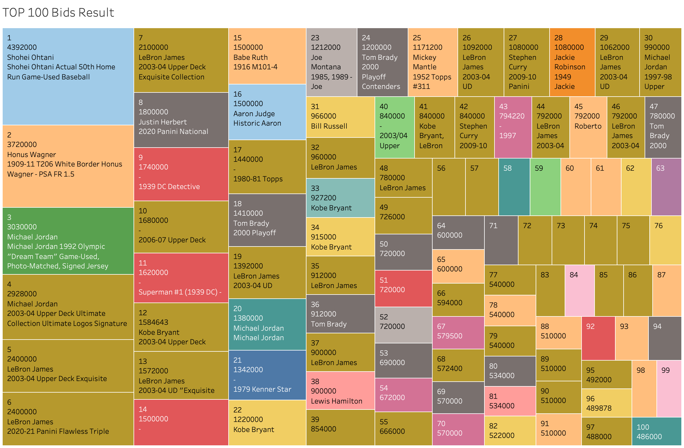如下圖所示,這是 Goldin 平台上歷史交易價格最高的前一百筆拍賣結果的可視化呈現。圖表中的區塊大小代表了每筆交易的成交金額,其中每個區塊標示了拍品名稱、成交價和相關細節。以下是其中幾個重要拍品的詳細解說: