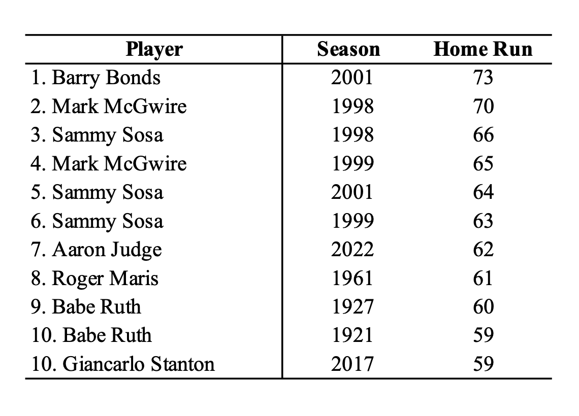 Barry Bonds 在 2001 年創下了單季全壘打紀錄(73 支),而單季勝場紀錄則由 Old Hoss Radbourn 在 1884 年創下,達成 60 勝(75 場出賽、73 場先發、投 678.2 局、防禦率 1.38)。這一勝場紀錄的誕生,正反映了 19 世紀棒球的獨特環境與比賽結構。