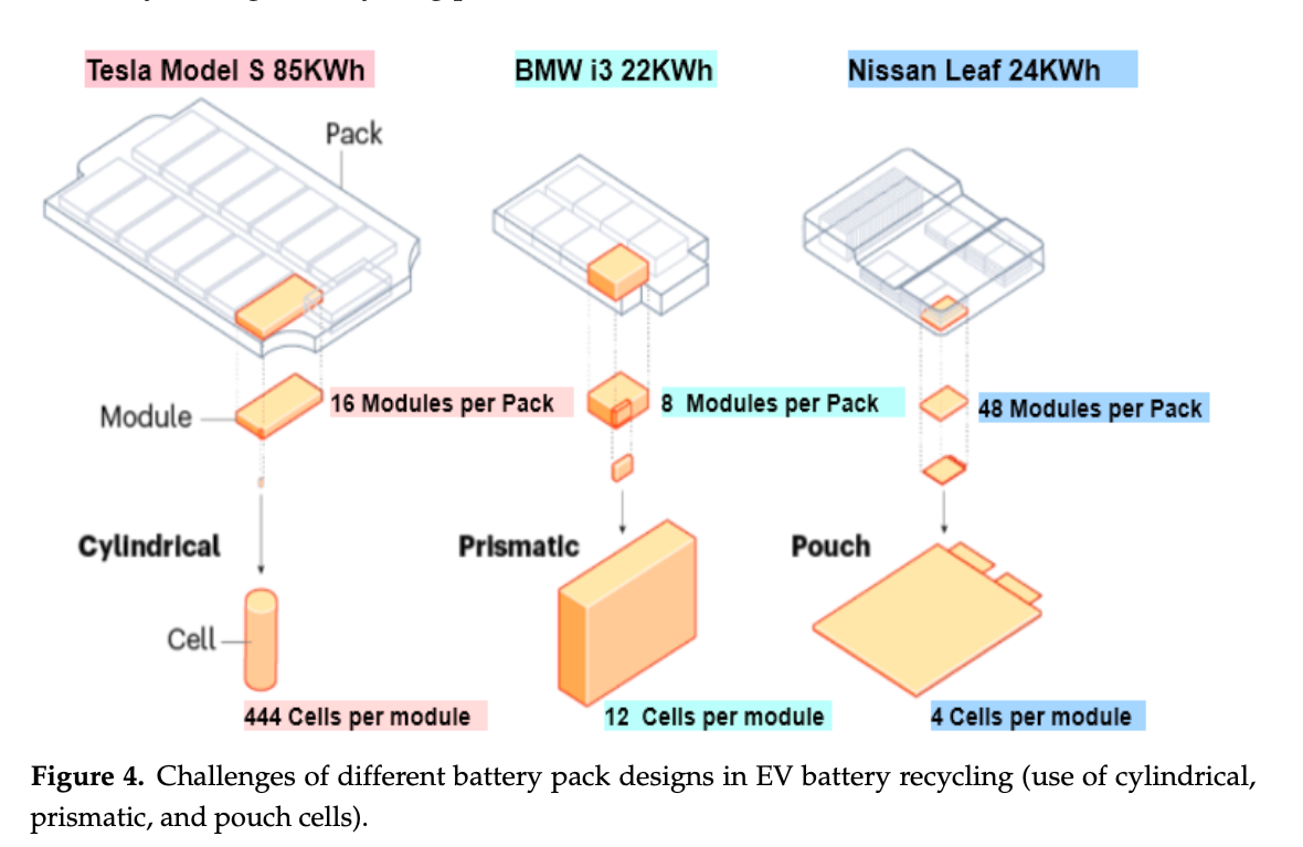 (Challenges of different battery pack designs in EV battery recycling — use of cylindrical, prismatic, and pouch cells)