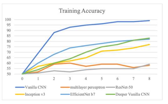 - Inception v3 (黃色) 和 EfficientNet b7 (灰色):準確率在 60%-75% 範圍內。