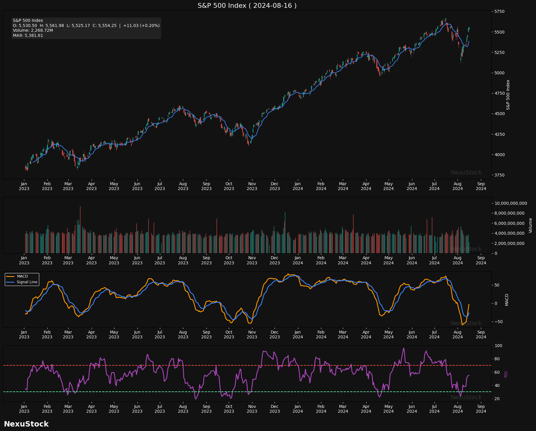 - 圖表顯示 S&P 500 指數從 2023 年初至 2024 年中持續上漲,近期有短暫回調後再次反彈。