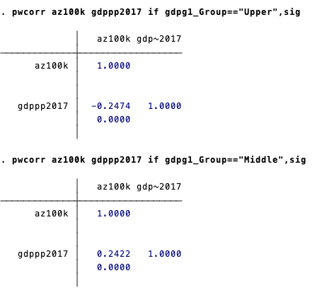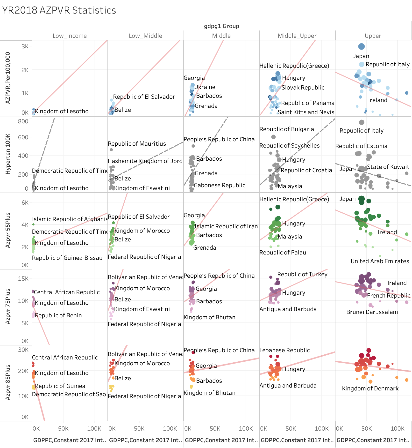 There is a positive correlation (increase GDPPC, increase AZPVR ) in low and middle-income countries, and a negative correlation in high-income countries (increase GDPPC, decrease AZPVR).