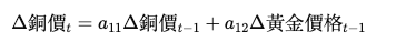 假設我們只關注銅價對自身和黃金價格的影響,方程可以表示為:
