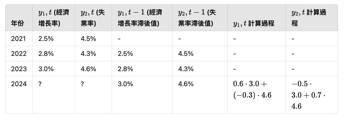 當然!為了讓這個例子更具體,我們可以把數據和計算過程以表格形式呈現,以便更清晰地理解 VAR 模型的應用。