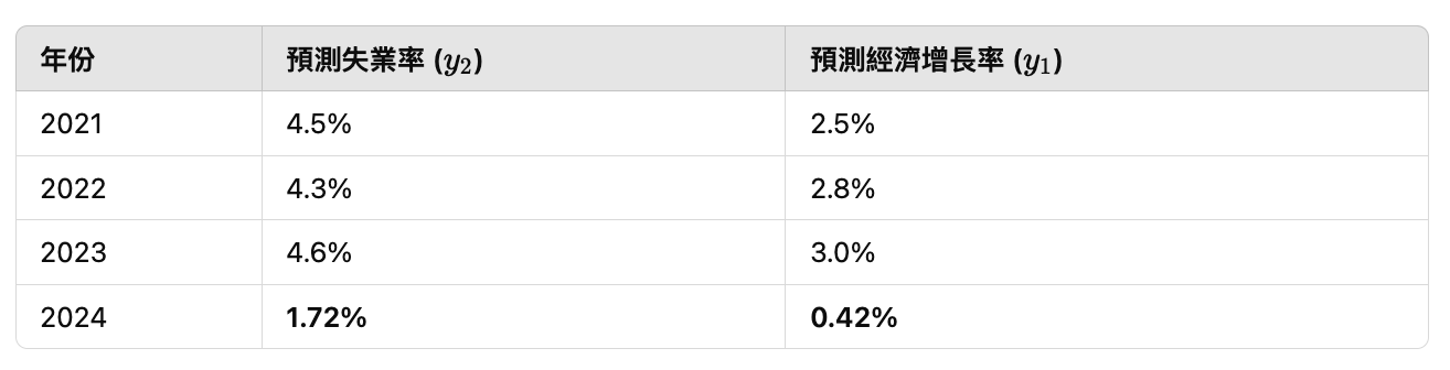 | 年份 | 失業率 (( y_2 )) | 經濟增長率 (( y_1 )) |