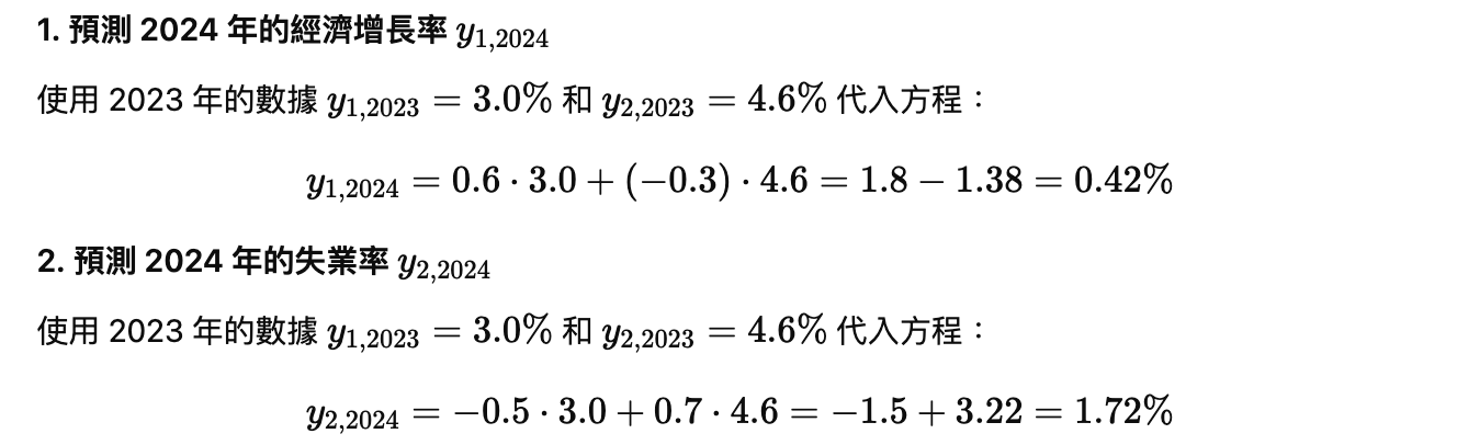 - 我們使用 VAR(1) 模型,基於 2023 年的經濟增長率和失業率來預測 2024 年的數據。